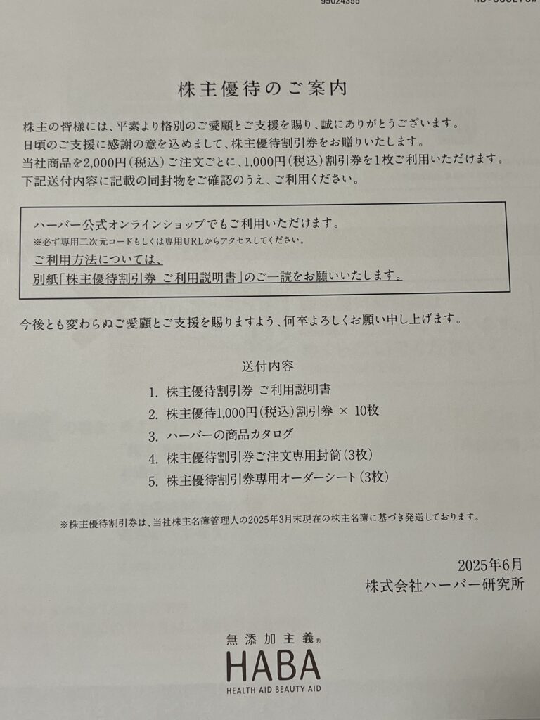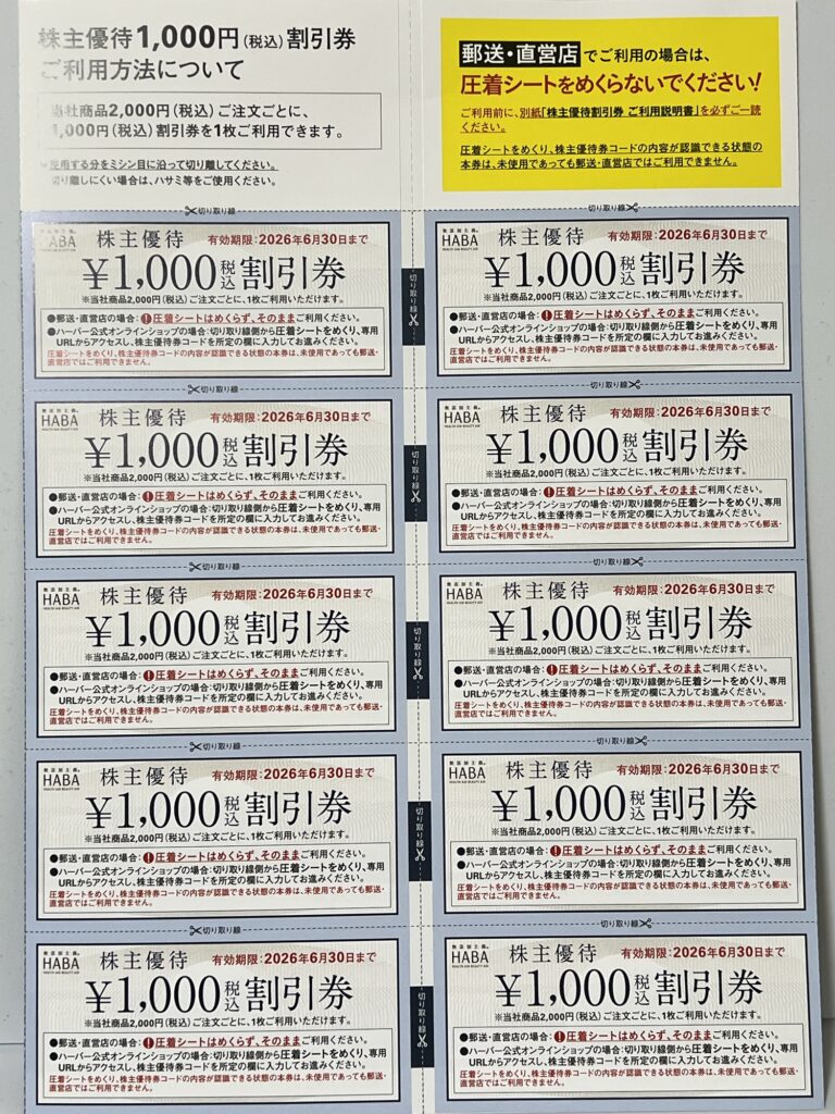 優待内容 | 10,000円(税込)の割引券(1,000円×10枚) 自社製品カタログ(化粧品等)・自社直営店舗(一部商品除く)・ 自社オンラインショップで利用可。 2,000円以上の買い物につき2,000円ごとに1枚利用可 |